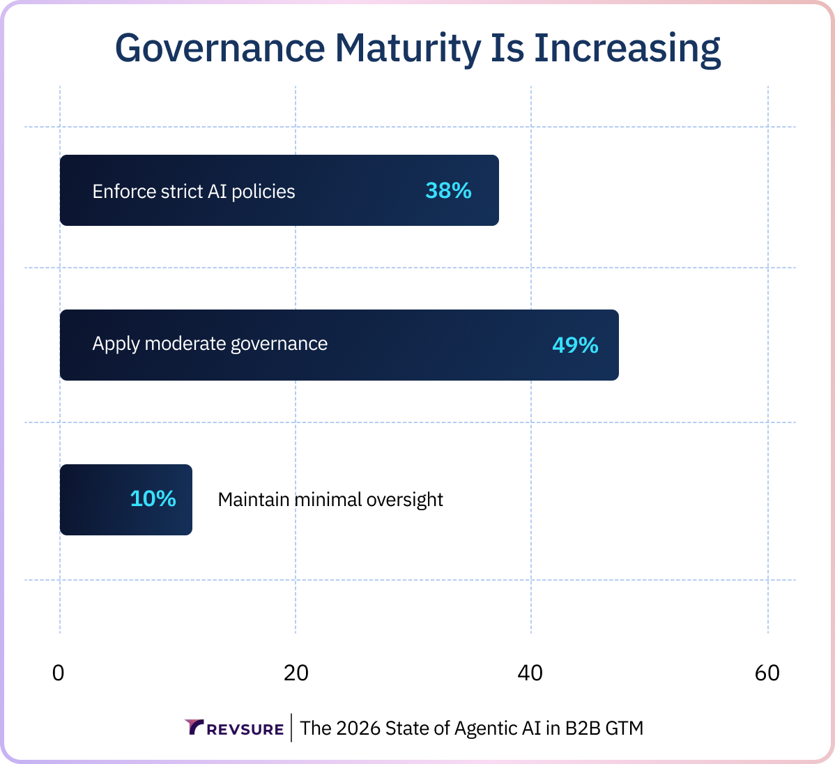 That shift is already showing up in how organizations are governing AI in practice. In the research, governance maturity is clearly increasing across GTM teams: 38% of organizations now enforce strict AI policies, while another 49% apply moderate governance frameworks. Only 10% report maintaining minimal oversight.