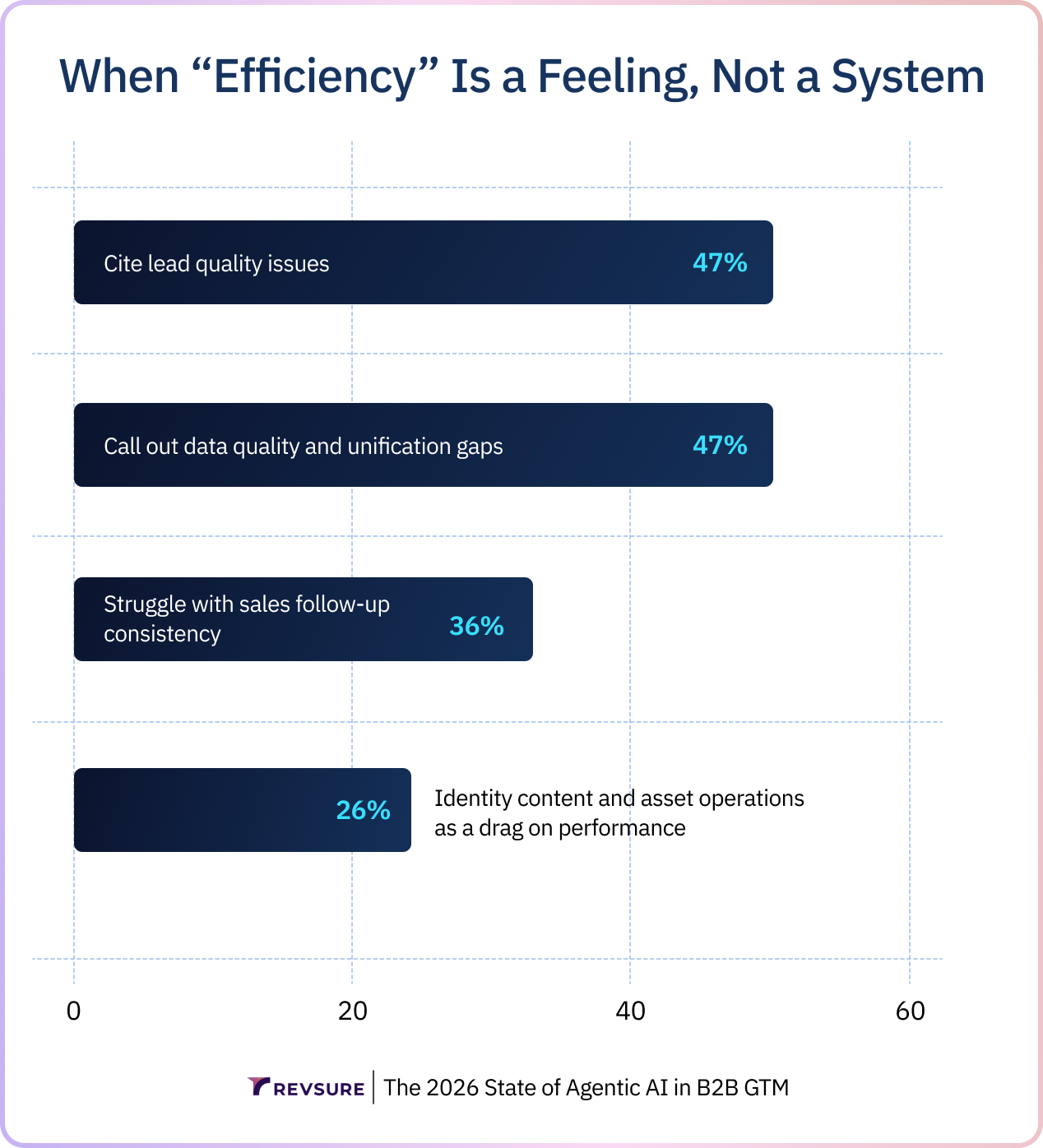 RevSure’s 2026 State of Agentic AI in B2B GTM research shows this tension clearly. When leaders were asked about their GTM execution, 58% said it was “very efficient” and another 37% said “somewhat efficient.” By their own assessment, almost every organization thinks it’s working well.