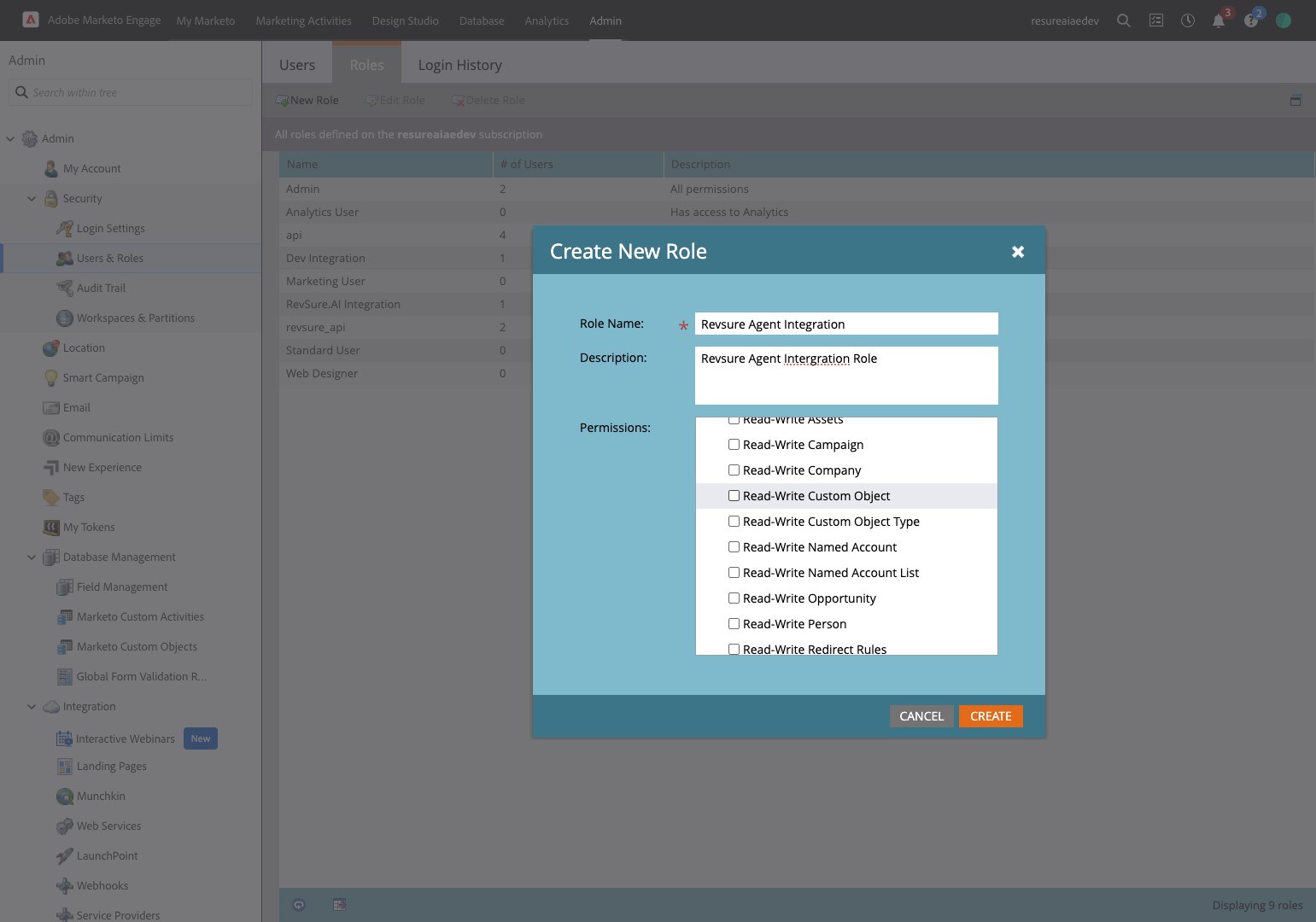 16. Type "Revsure Agent Intergration Role"