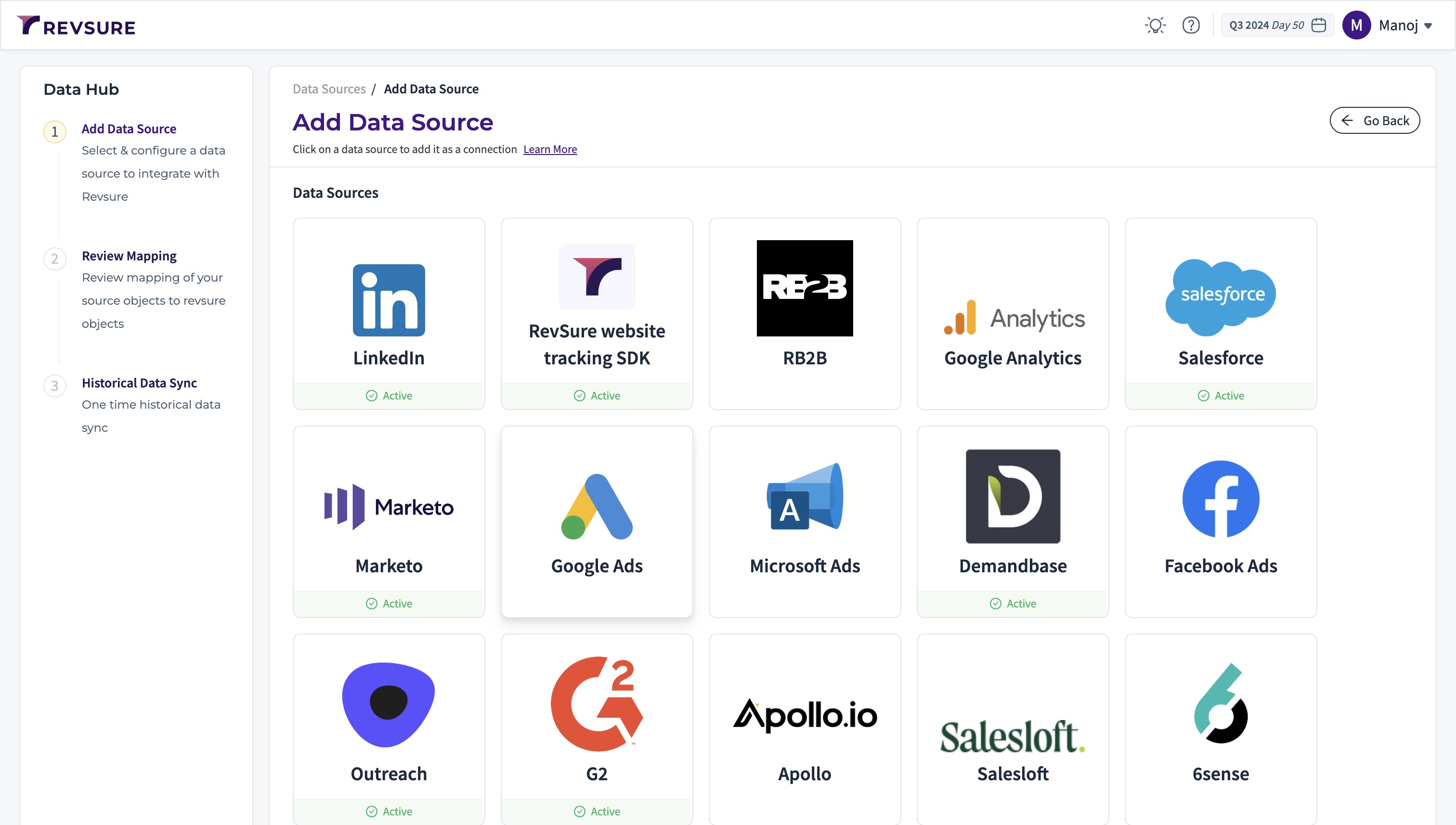 1. Navigate to the data-hub module in the RevSure account. Click on the Add data source button