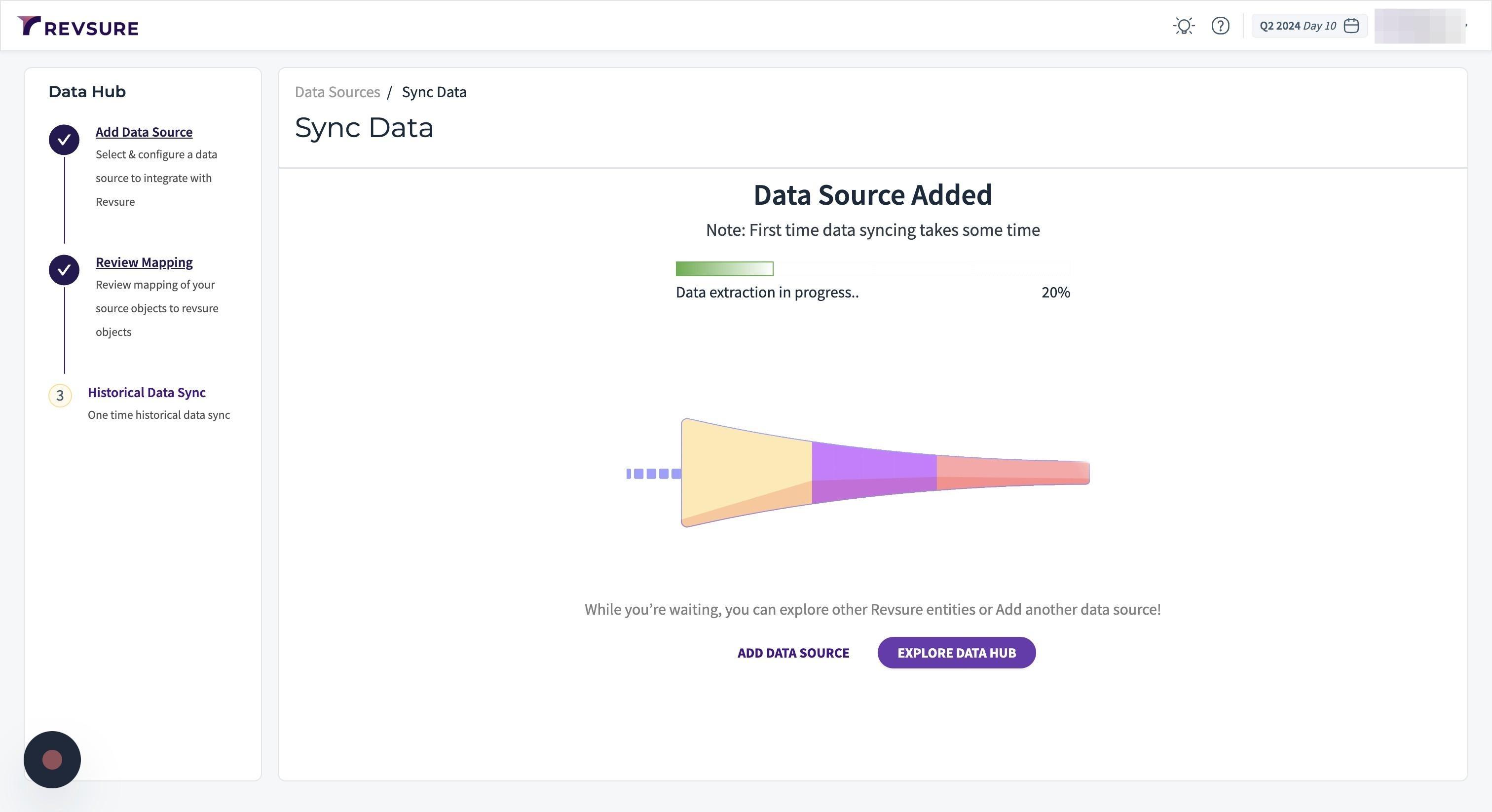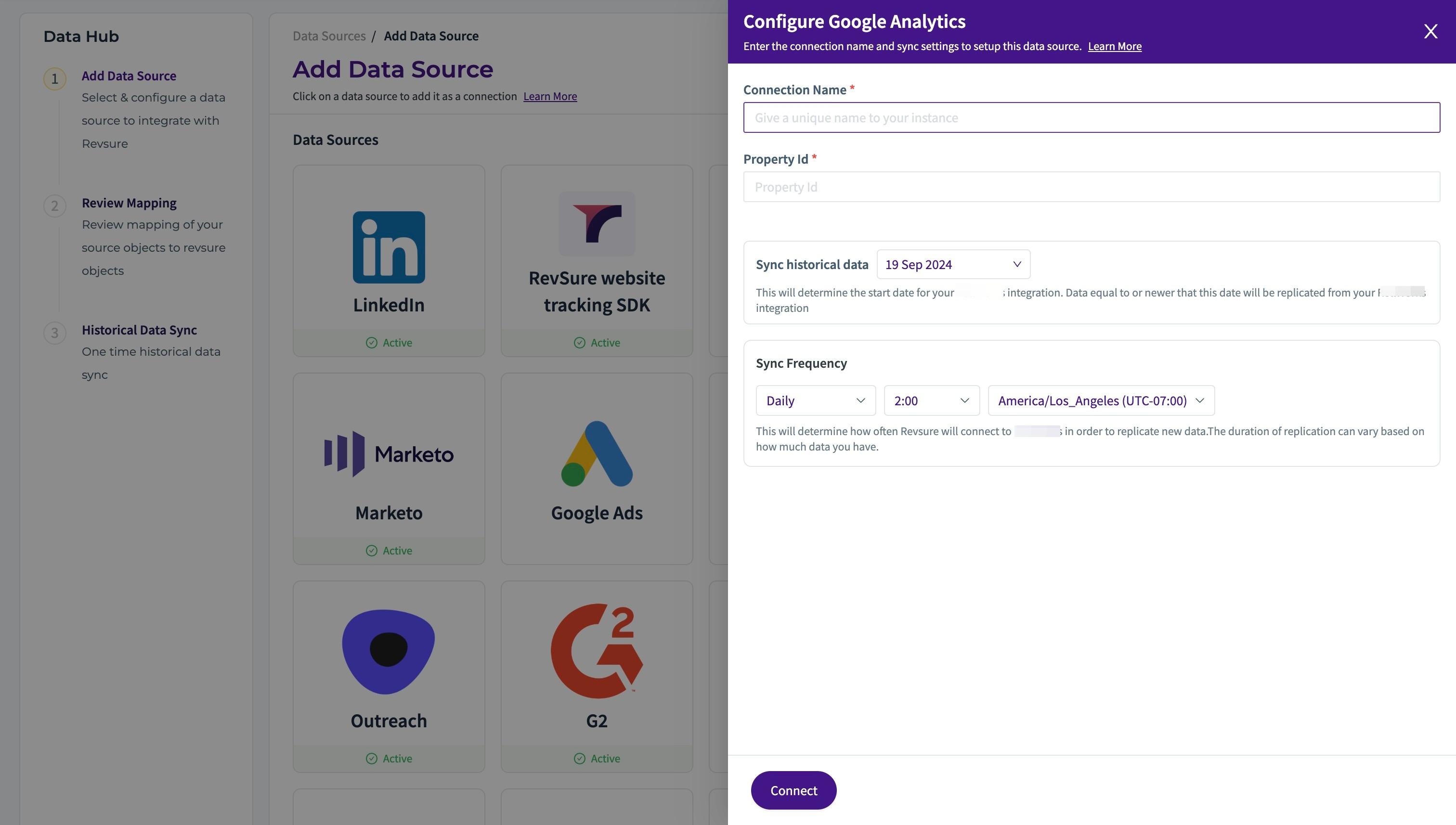 1. Navigate to the data-hub module in the RevSure account. Click on the Add data source button