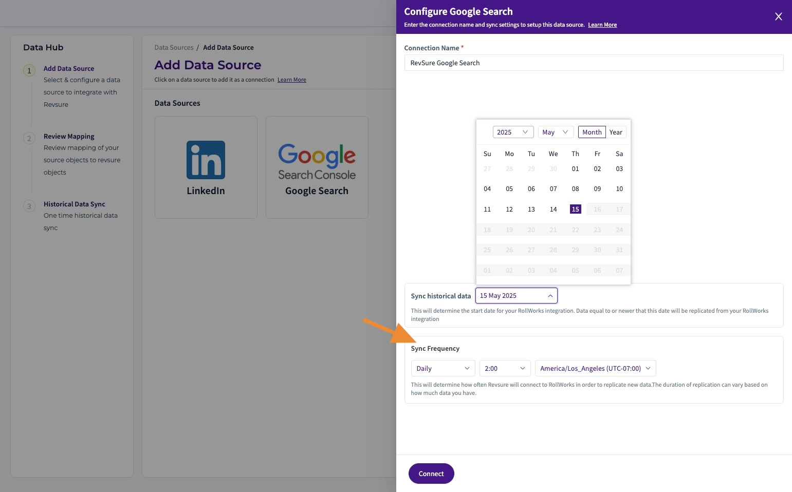 7. Choose the date from where you want to start syncing the data, also sync frequency, time and timezone to trigger the sync can be selected