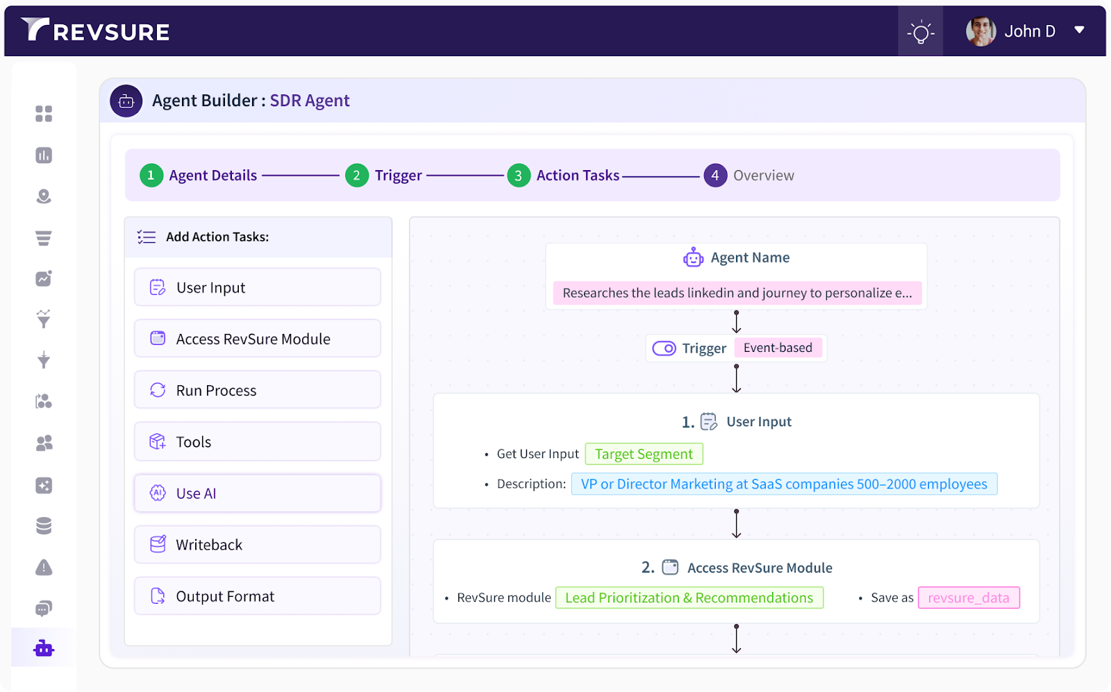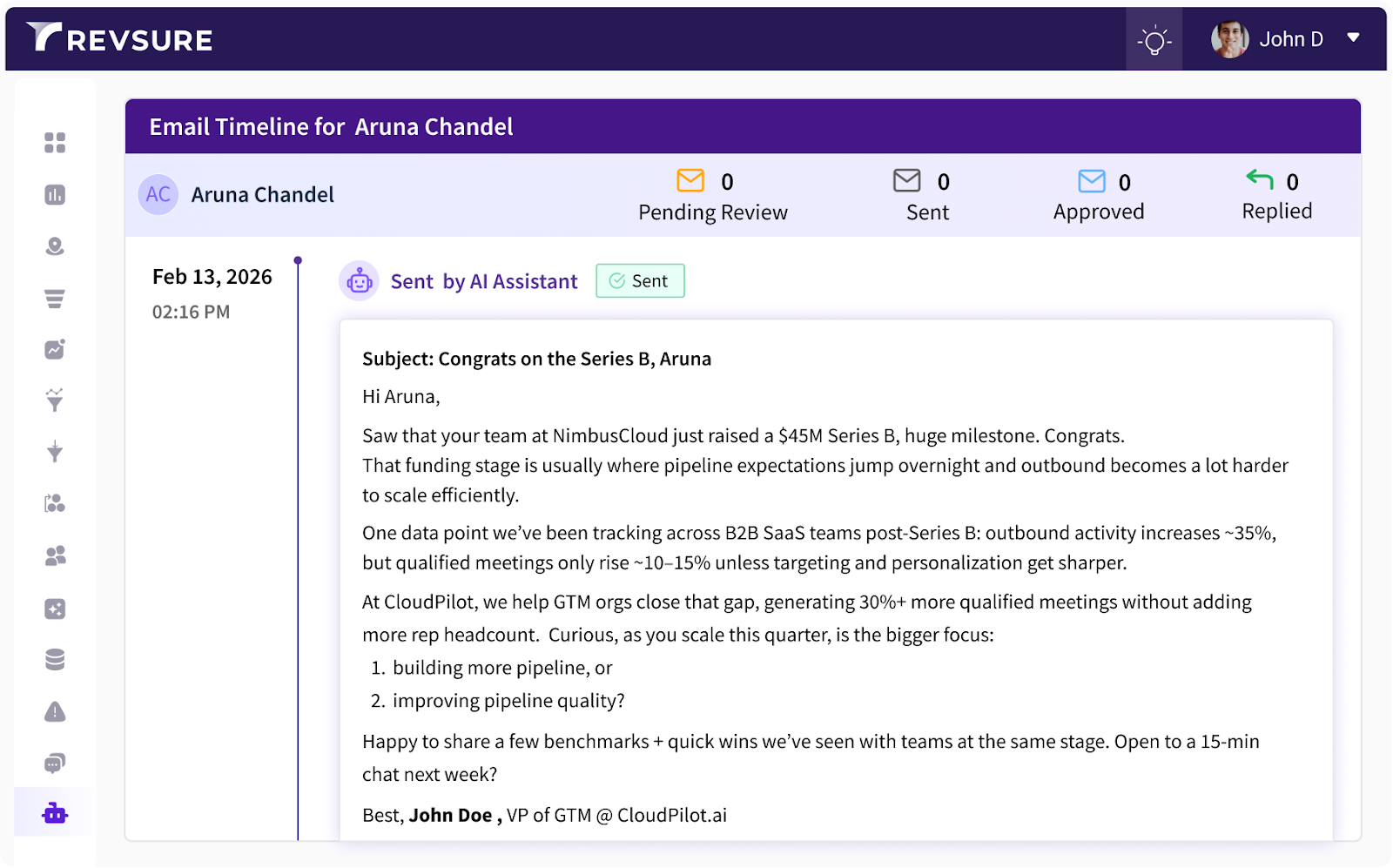 RevSure’s SDR Agent is built to do more than automate outreach. It autonomously identifies high-intent accounts, engages them with context-aware messaging, and qualifies signals into pipeline, operating continuously and informed by real buyer behavior. Unlike traditional outbound tools that only see a lead record or email thread, the RevSure SDR Agent operates with full-funnel visibility. It understands website activity, campaign engagement, ICP fit, CRM history, and buying group dynamics, ensuring execution is driven by revenue context, not just activity volume.