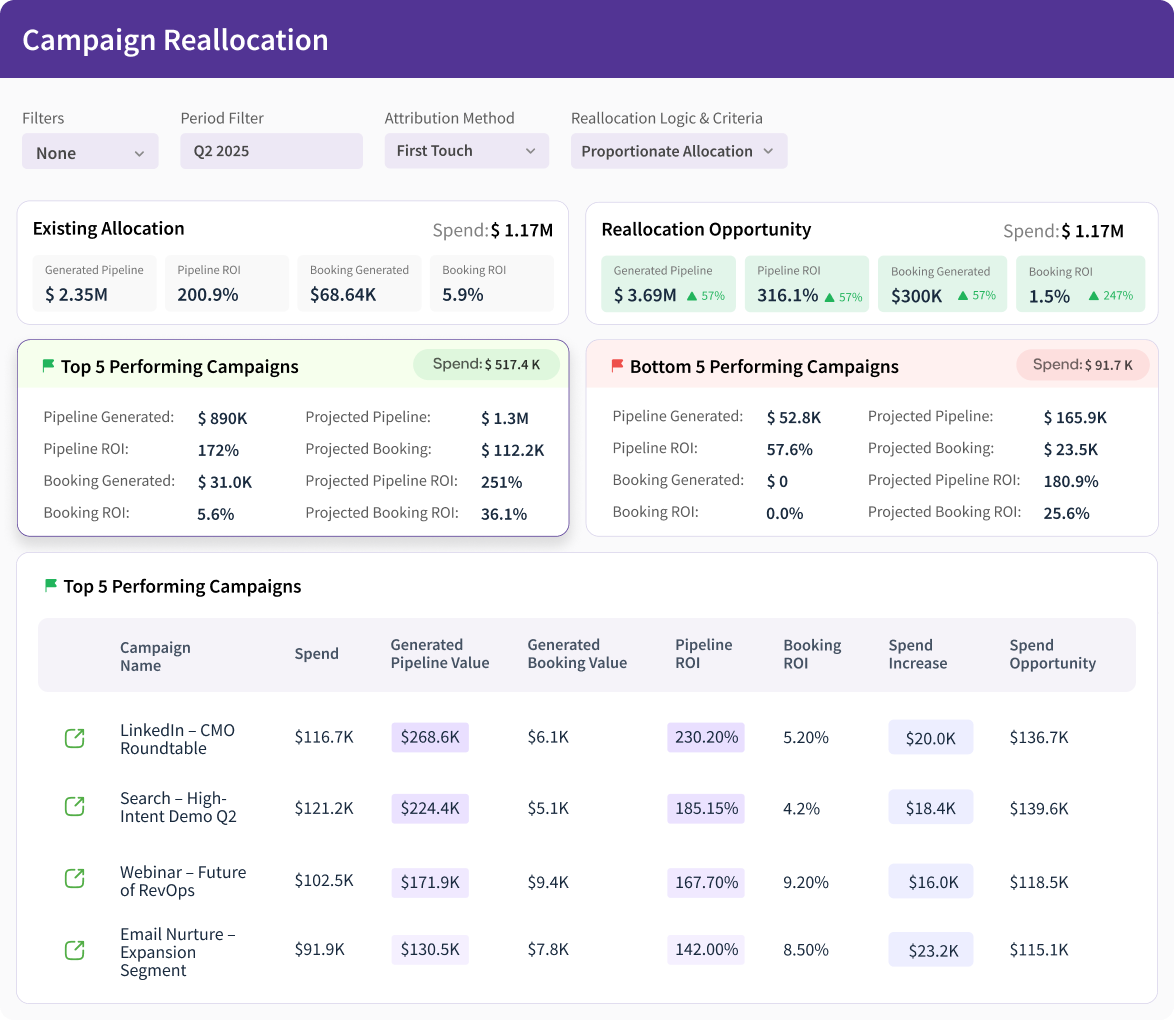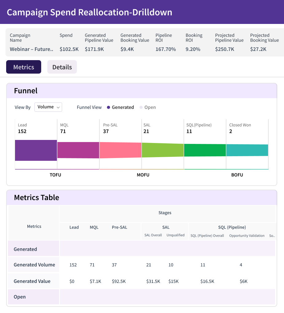 Every campaign can be analyzed in detail through RevSure’s diagnostic panel, which provides funnel analytics, conversion behavior, and performance breakdowns across generated and open stages. Leads, accounts, opportunities, bookings, and member engagements are accessible through structured tabs, each showing segment composition and conversion patterns. This visibility reveals why a particular campaign is categorized as high or low performing and ensures each reallocation decision is backed by granular evidence.