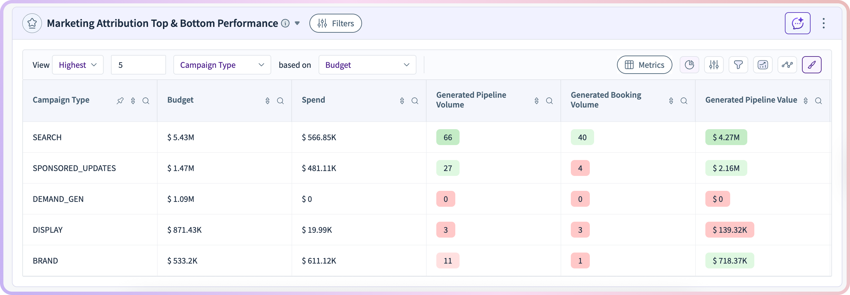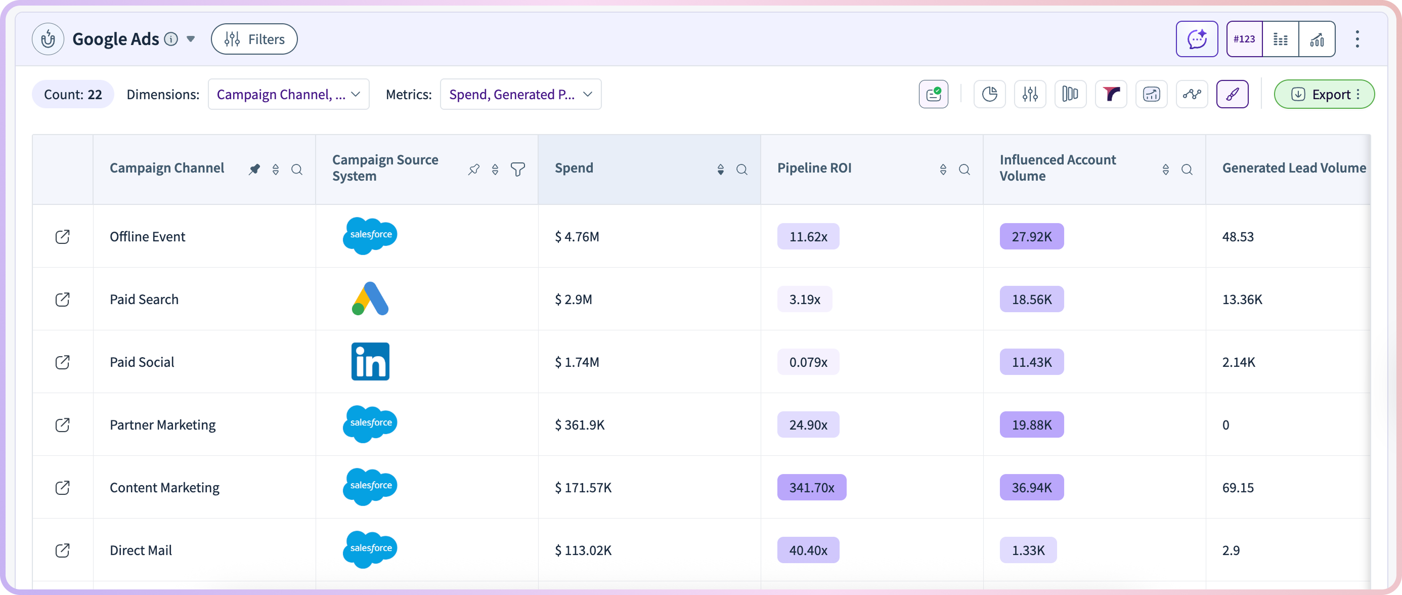 To help teams use these insights, the template includes comprehensive breakdowns that show ROI and impact for each channel. Teams can see which channels are helping accounts move forward and which ones might need improvement.