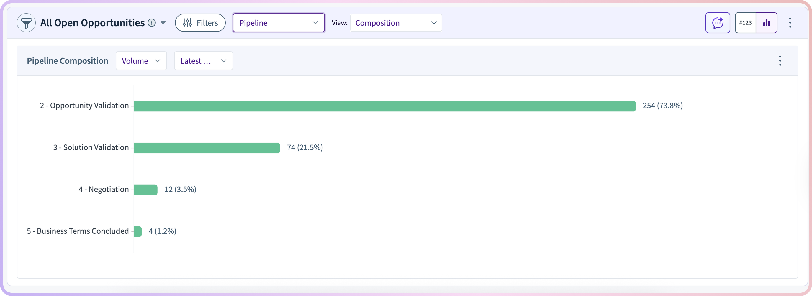 It also provides stage-level visibility through open opportunity composition views, helping teams understand where active deals sit in the funnel and allowing targeted pipeline actions.