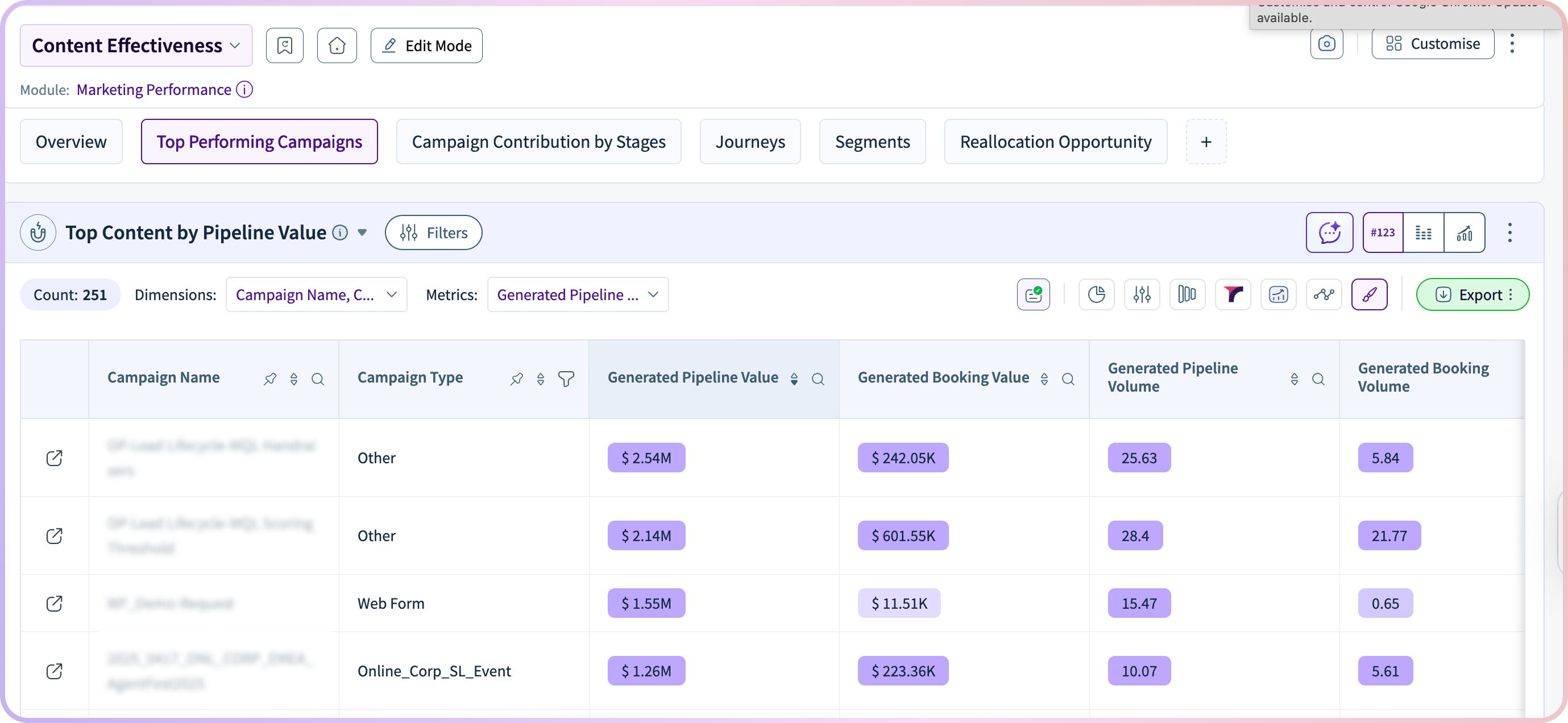 The Content Effectiveness Dashboard shows which assets, topics, and channels create real pipeline; not just engagement. It connects content journeys to sign-ups, SQLs, and opportunities. Built for B2B marketing and revenue teams, it turns content performance into measurable revenue impact.