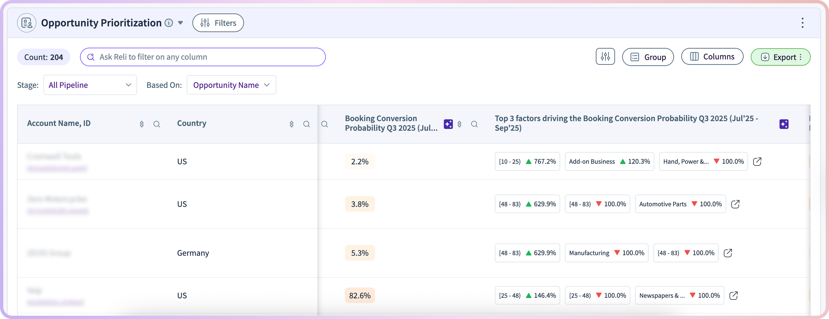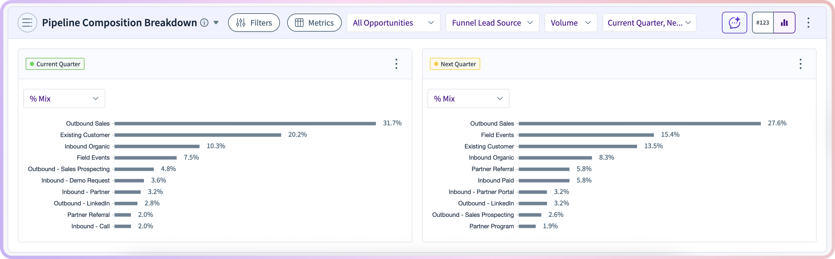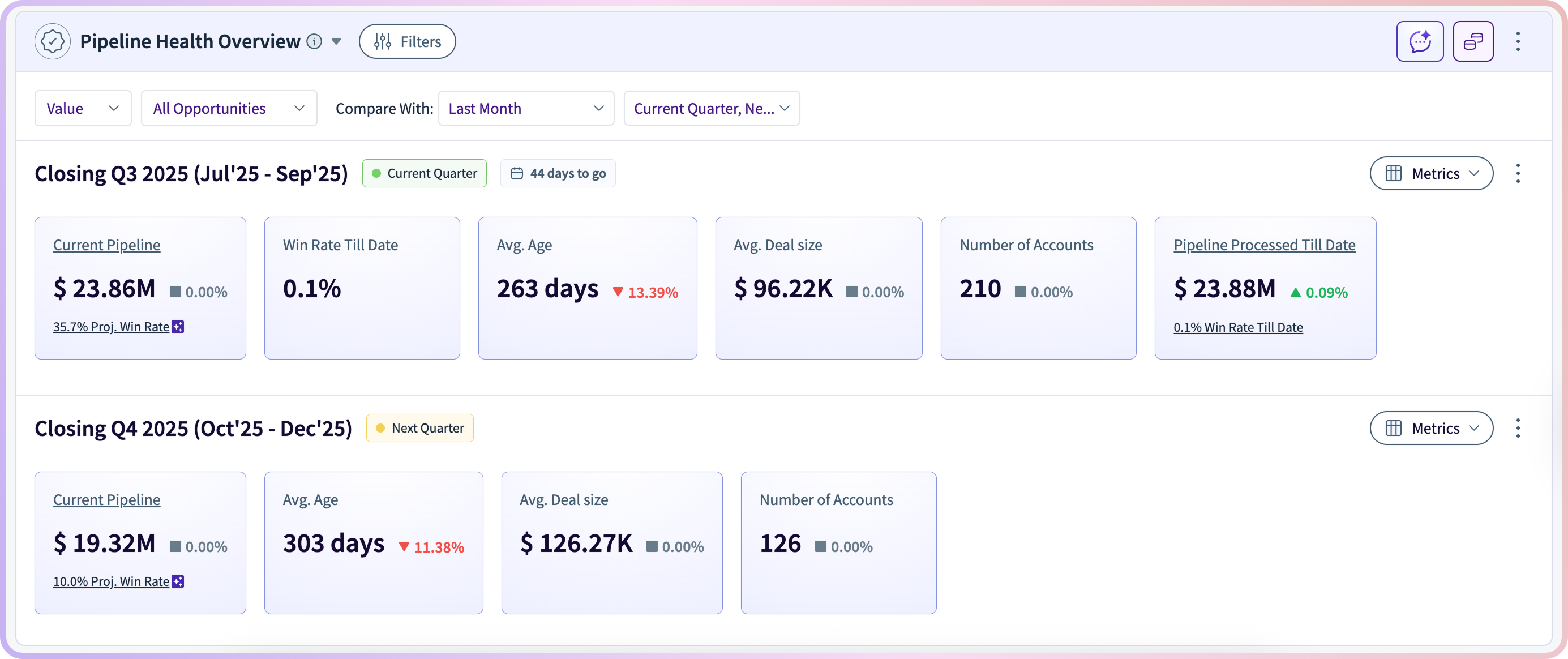 To support forward-looking decisions,pipeline health overviews provide a snapshot of current and next-quarter pipeline strength. Leaders can compare pipeline size, win rates, deal size, and stage distribution, while pipeline composition views help prioritize accounts based on value and dynamics.