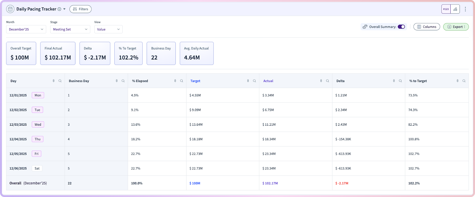 Accurate pacing isn’t just about reporting; it directly impacts how teams make decisions. When pacing is based on business days, leaders can confidently evaluate whether performance is truly ahead, behind, or exactly where it should be. With the Daily Pacing Tracker, teams gain clarity across critical questions: