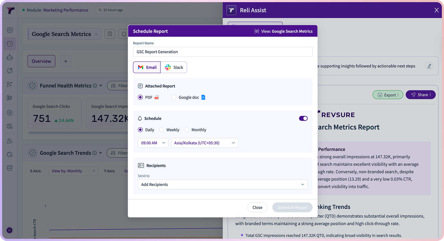 RevSure’s AI Report Scheduling is designed to close that gap. Instead of relying on teams to go looking for insights, it ensures insights reach them, automatically, consistently, and in the tools they already use, like Email and Slack.