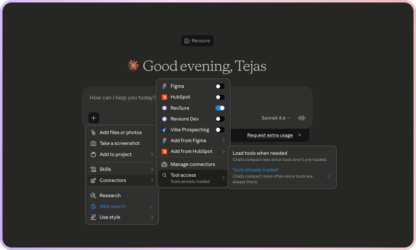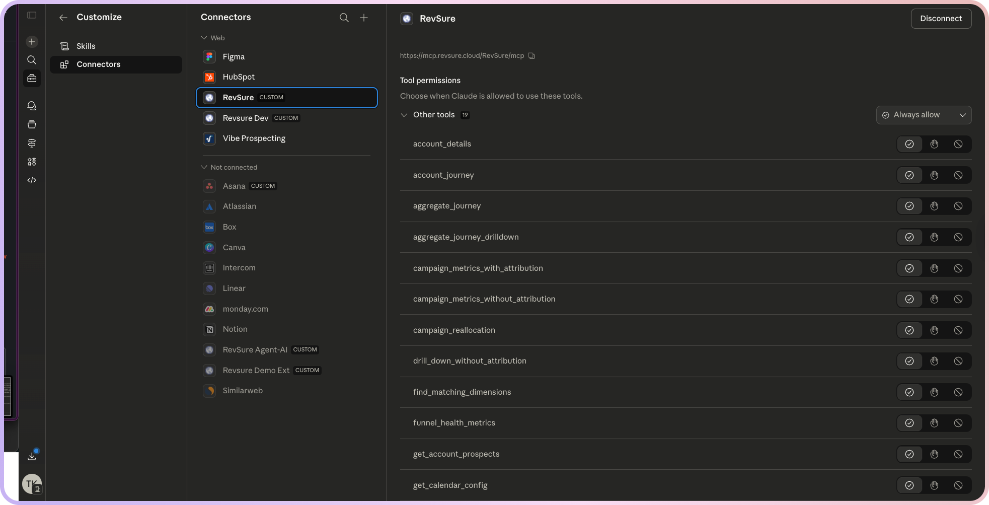 Once authenticated, the connector is active — you can now use Claude with RevSure.