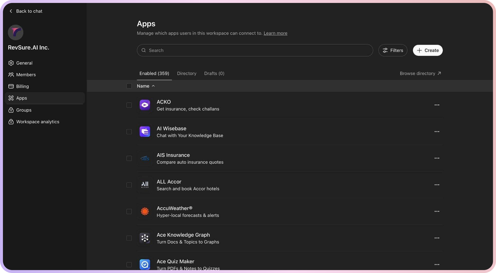 Enterprise / Edu plan: Admins/owners can refresh tool actions from Workspace Settings → Apps → RevSure → See Details → Refresh, and can enable/disable individual actions after publishing. In practice, users have reported for the refresh button failing, in which case delete-and-re-add remains the reliable fallback.
