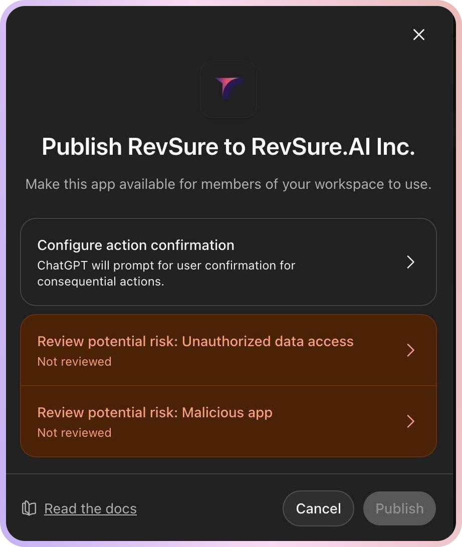 📌 Once published, everyone in your workspace can just connect and start using RevSure in ChatGPT — no individual setup needed!