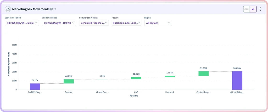 Turn marketing performance shifts into actionable insight. With the Marketing Mix Movements widget, RevSure breaks down how every channel, program, and factor contributes to changes in your key metrics across two time periods. Each factor’s impact is clearly visualized through a waterfall chart and detailed in a tabular breakdown, giving you precise clarity into what drove the pipeline up or down.