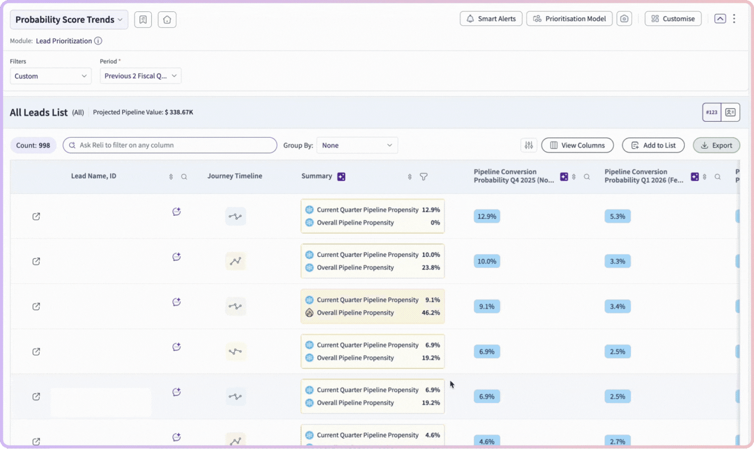 To access Probability Score Trends, go to Lead or Opp Prioritization Module -> Click on any metric value to access the trend modal or access it from the drill-down in the Trend Analysis tab