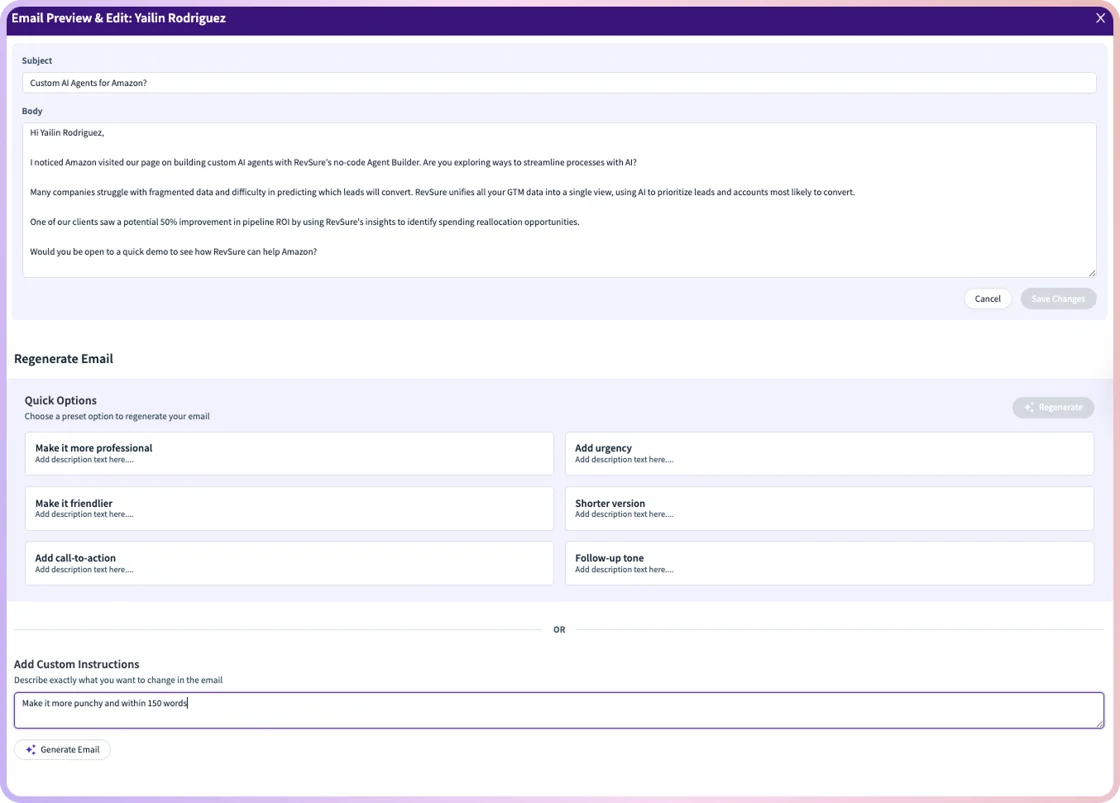 Emails generated by our agents can now be quickly regenerated or refined using either a custom prompt or preset instructions. This lets senders easily adjust tone, messaging, and requirements at both the email body and subject line level.