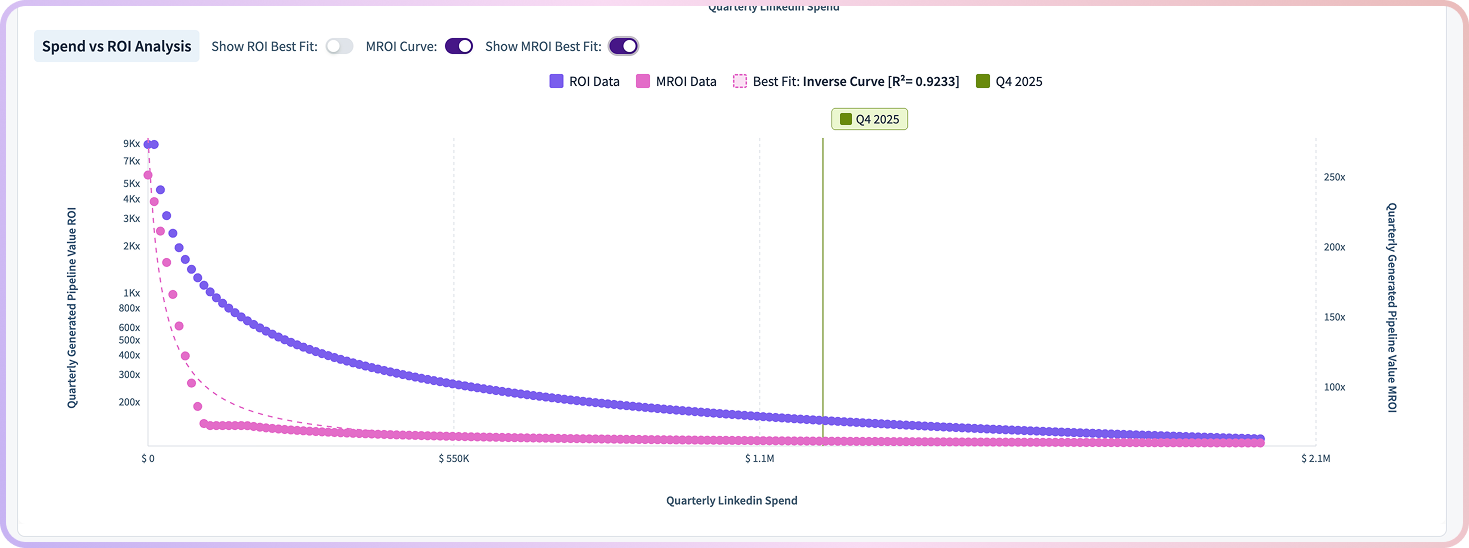See exactly how each incremental dollar impacts performance. With MROI (Marginal ROI) added to the Response Curve, you can compare ROI and MROI side by side, spot diminishing returns early, and optimize spend with precision.