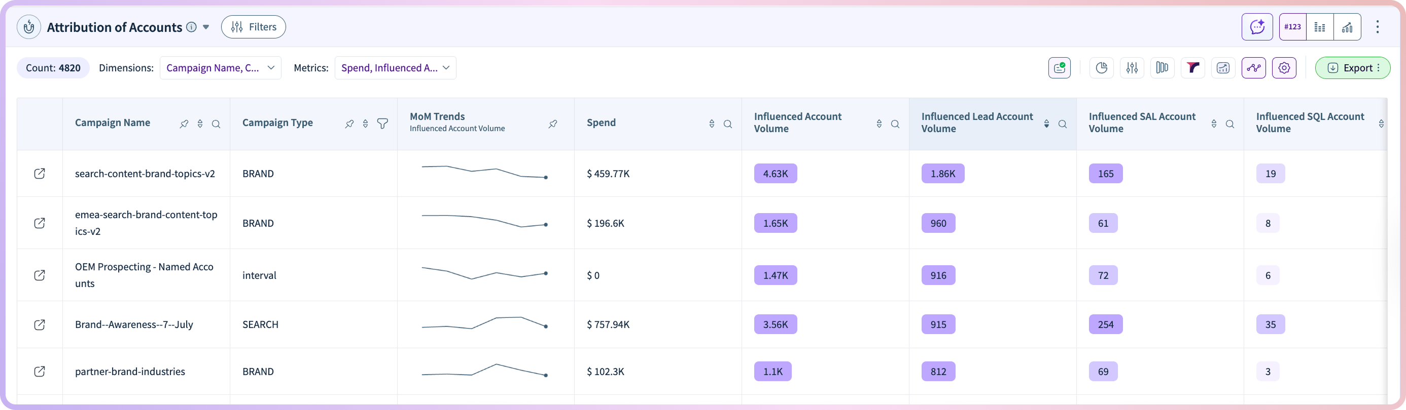 Can you measure campaign impact at the account level? Yes, the dashboard connects campaigns and channels to account progression, showing how marketing efforts influence engagement, opportunities, and pipeline value.