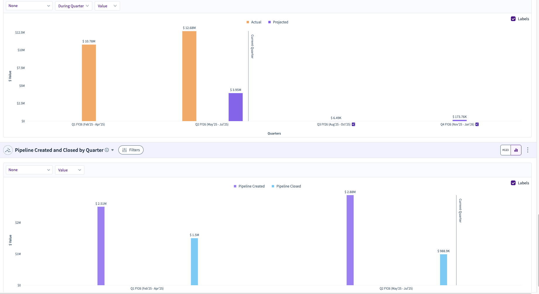 Shows pipeline generation, progression, and closure trends over quarterly cycles. Includes actual vs projected comparisons and push/pull balances to evaluate pipeline health, velocity, and sustainability.