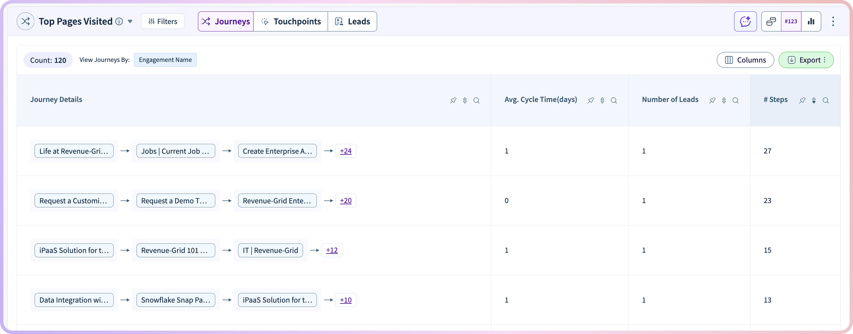 Teams can use this to identify where journeys accelerate or stall. It becomes easier to pinpoint drop-off points, optimize calls-to-action, and improve next-step experiences. Instead of optimizing individual pages, teams can focus on strengthening entire journeys that influence buying decisions.