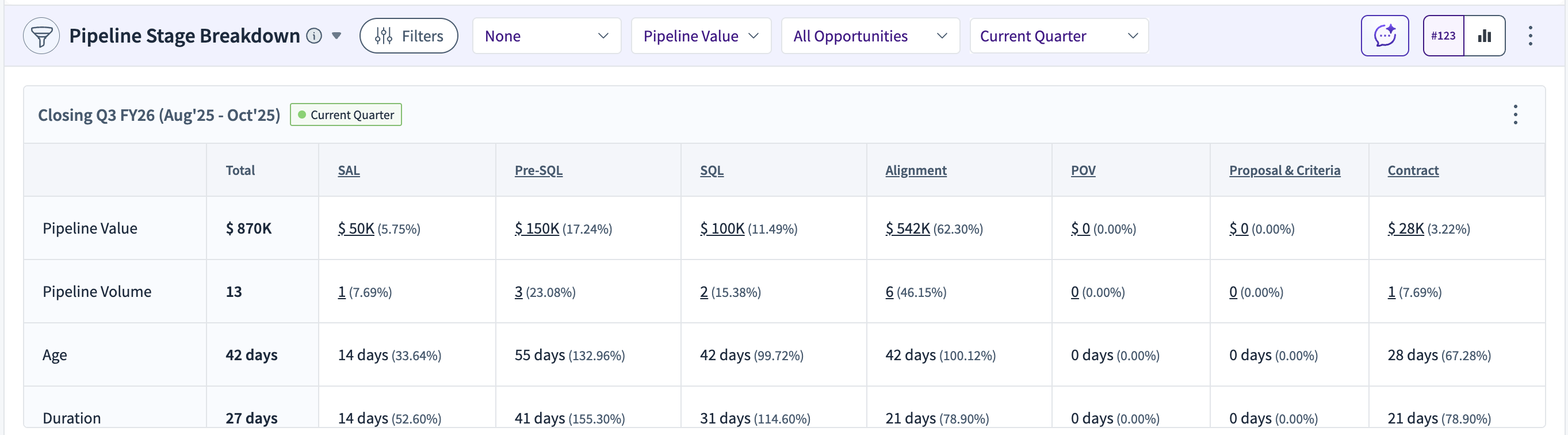 Pipeline Stage Breakdown Shows pipeline value, deal count, average age, and duration across every sales stage (e.g. SAL, SQL, Alignment). This layered view exposes where deals are bottlenecked, aging, or concentrated—enabling targeted interventions and improved opportunity flow.