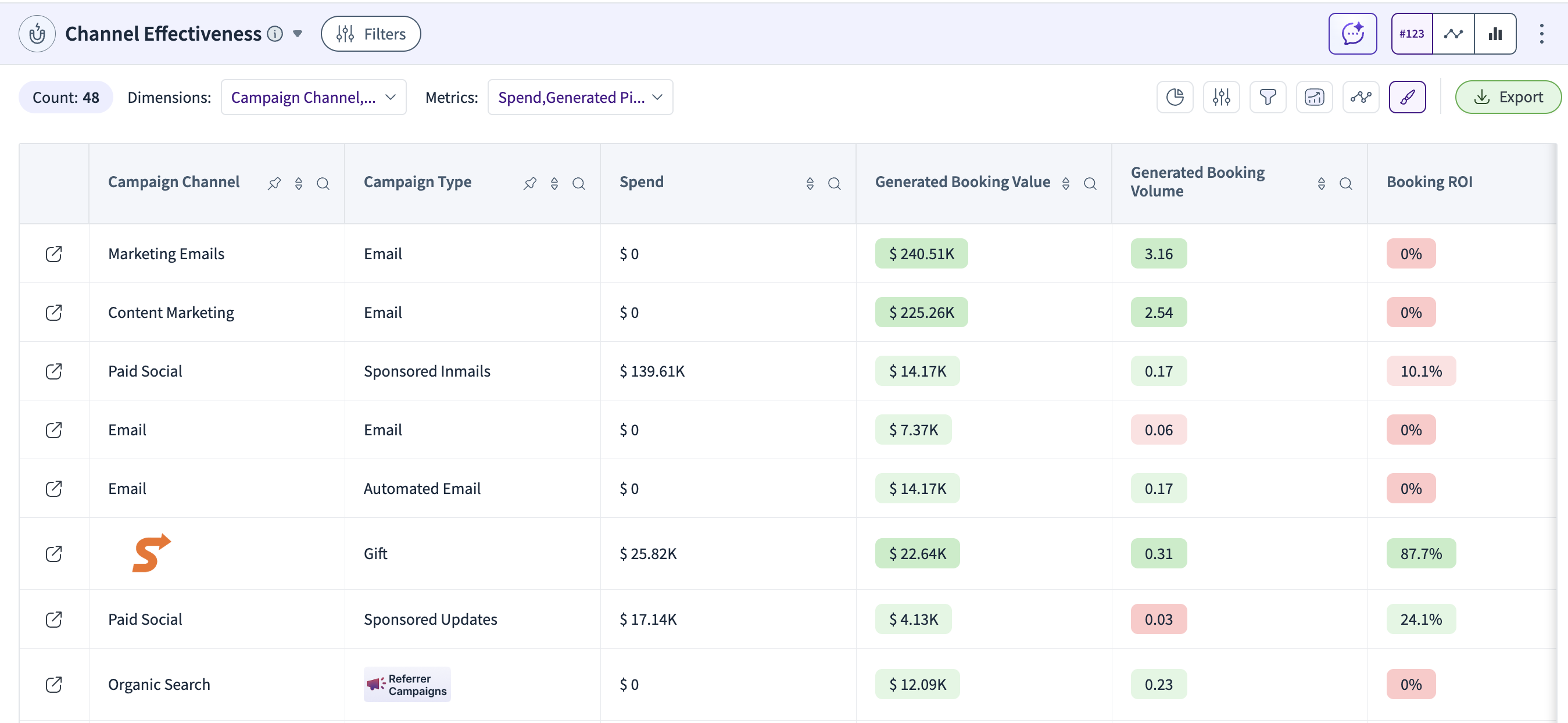Compares spend, booking pipeline, booking volume, and ROI by campaign channel and type (e.g., Email, Paid Social, Events). Helps identify which channels deliver the highest revenue impact per dollar, and which underperform relative to their budget.