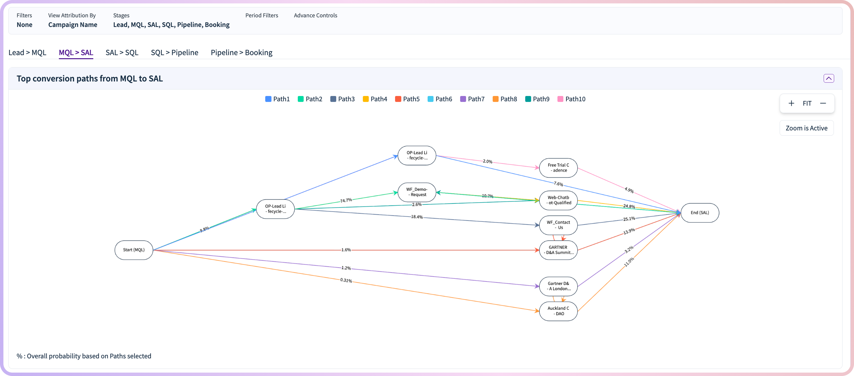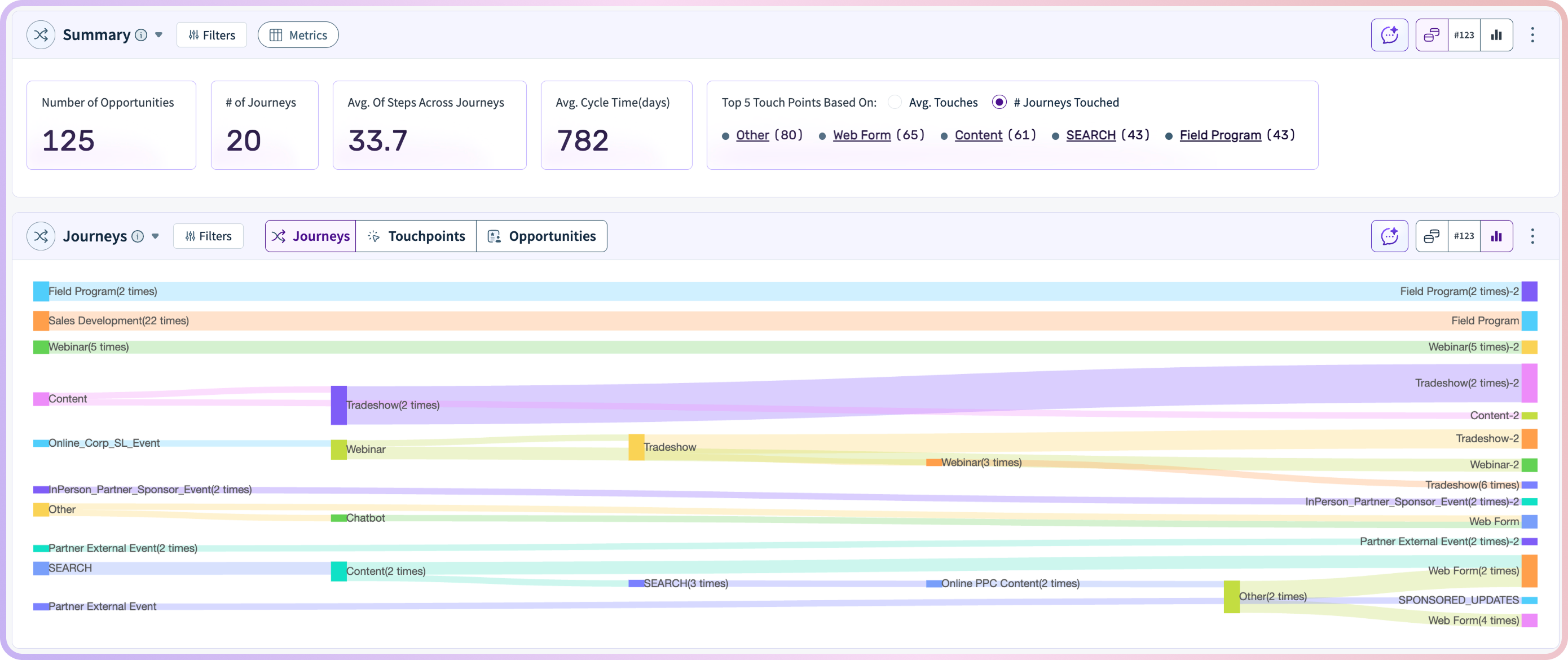 Teams can identify which campaign sequences drive opportunity creation, which combinations support progression across the funnel, and which initiatives consistently contribute to high-value conversions. This enables more strategic campaign planning and better allocation of resources.