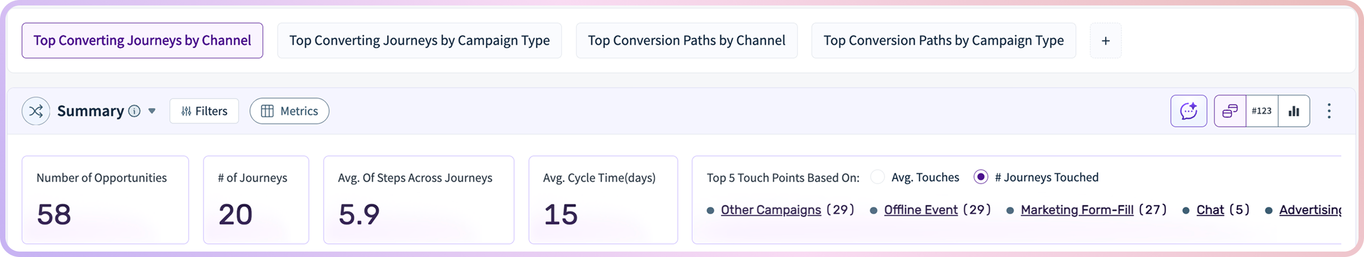 What are high-converting journeys? High-converting journeys are specific sequences of channel and campaign interactions that consistently lead to strong conversion outcomes and pipeline creation.