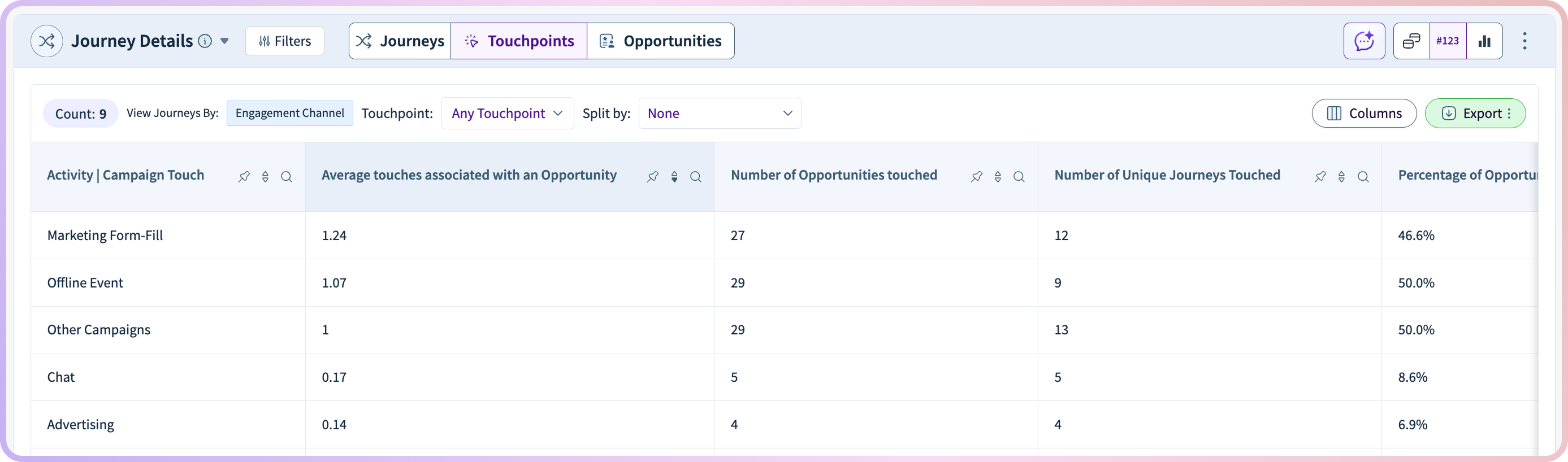 This view helps teams understand the role each channel plays in driving initial engagement, supporting mid-funnel progression, and influencing final conversion. With this clarity, marketing leaders can better allocate budget and optimize channel strategy based on actual conversion impact.